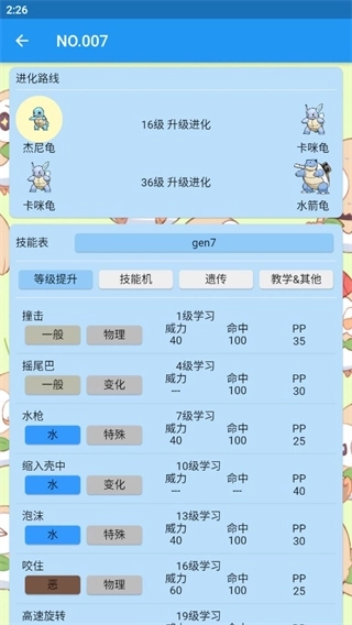 5、往下划还能看到进化路线以及技能表。