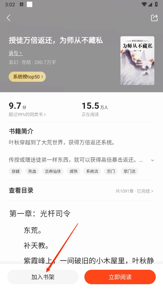 3、然后进入小说阅读详情页,点击"立即阅读"。