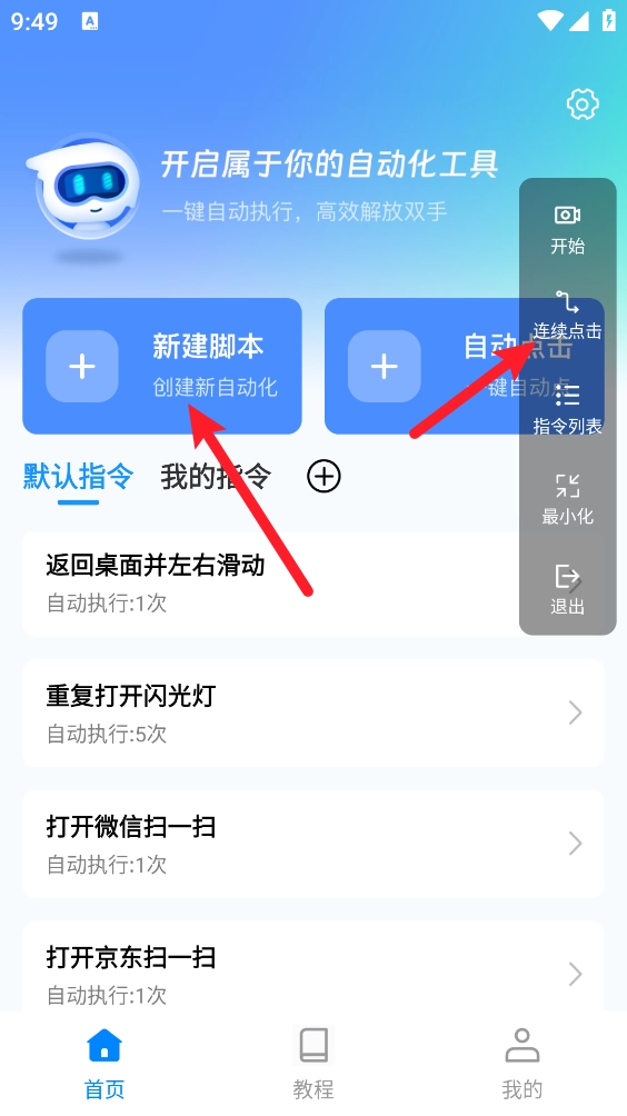 5、回到主页后新建脚本,按照图示选择“连续点击”选项。