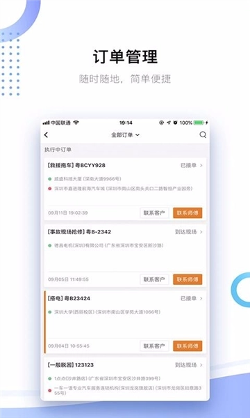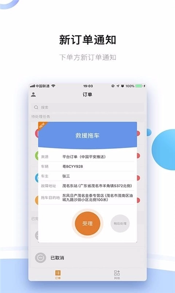 【操作便捷,规范护航】全流程配备规范指引,新人也能迅速上手;从新订单接收、受理、派单,到催单提醒、救援完成,全程均有系统消息实时提示,有效避免因信息遗漏造成的时效延误!