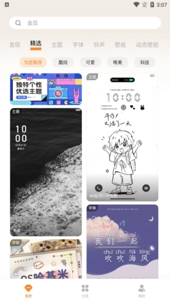 4、海量资源随心选:这里有专业设计师精心打造的主题、字体、铃声、锁屏、壁纸以及熄屏时钟(部分机型适配)等丰富精品内容,总能找到合你心意的那一款。