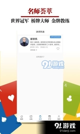 3、这里名师云集,桥牌世界冠军、桥牌大师与金牌教练将带来专业的授课指导。