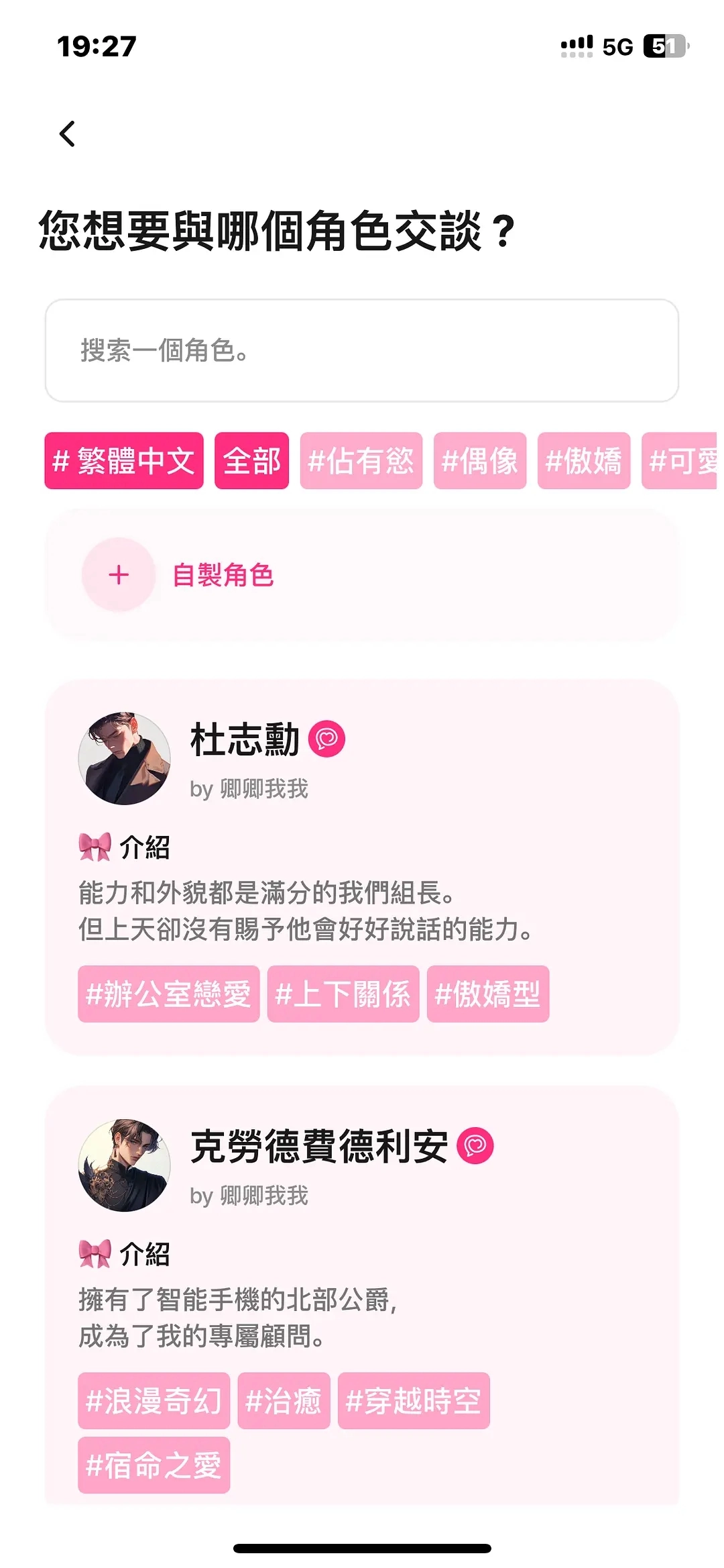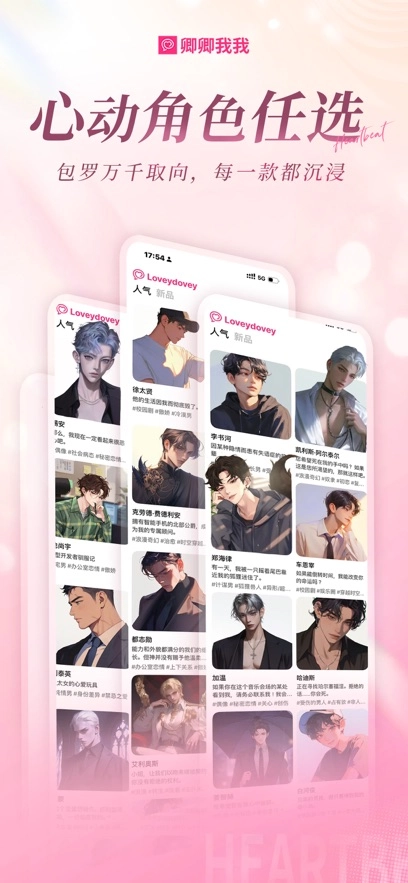1、涵盖KPOP偶像、日漫和国漫热门角色以及原创人物设定,借助“傲娇/霸总/年下/病娇/职场前辈”等标签进行细分,用户能够一键开启互动。