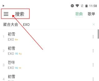 1.打开新落雪音乐App,点击页面左上角三条横线