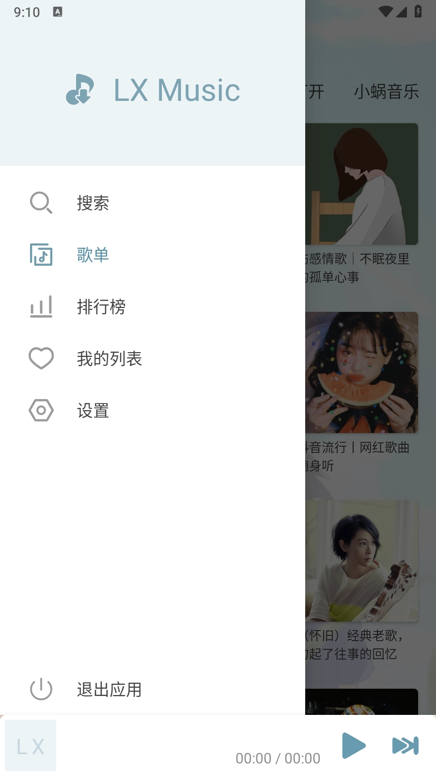 1.启动新落雪音乐应用,点击左上角的三条横线图标,展开侧边栏菜单