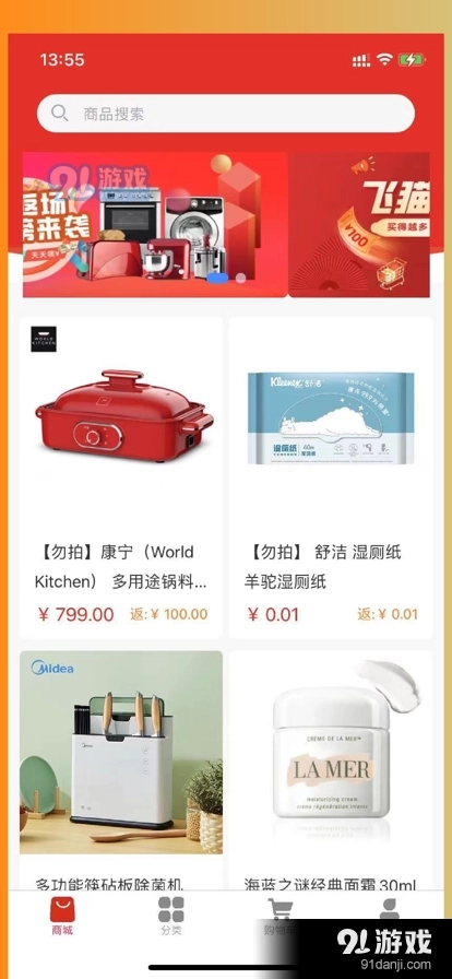 2、飞猫的全额返活动设计十分贴心,不仅界面简洁优雅,商品分类也清晰明了,能让用户更便捷地查找和选购商品。