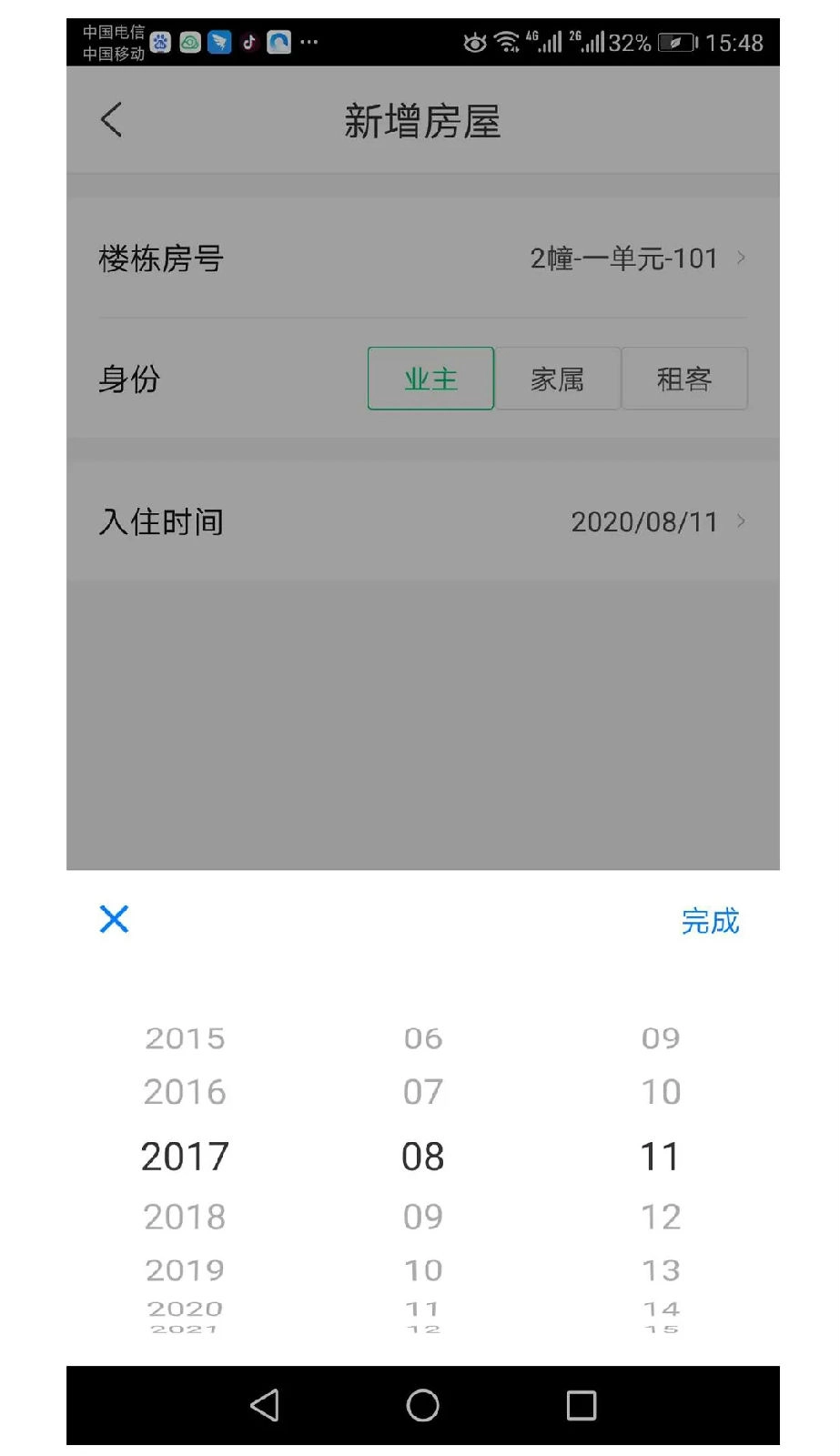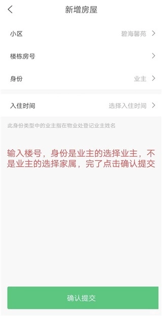 2、请准确填写楼号与房间号,并选择对应的身份:若是业主则选“业主”,若非业主则选“家属”。信息填写正确后点击提交即可。若提交者为业主,物业将在核实信息后点击通过。