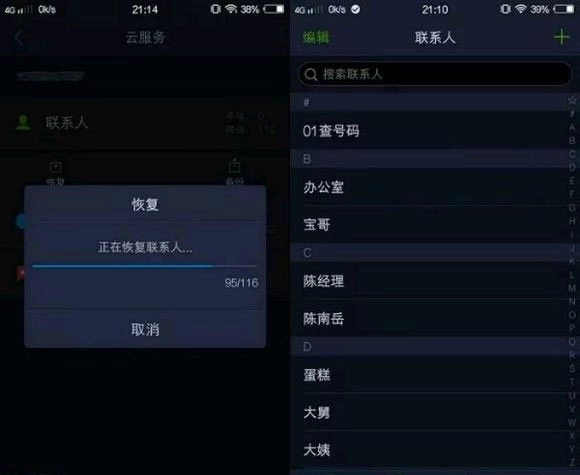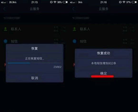 依据信息量大小,云服务会迅速借助网络把信息恢复到手机里,操作完成后点击确定按钮即可。
