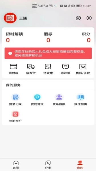 提供提酒记录查询、个人地址管理、客服咨询联系以及操作指南查看等功能