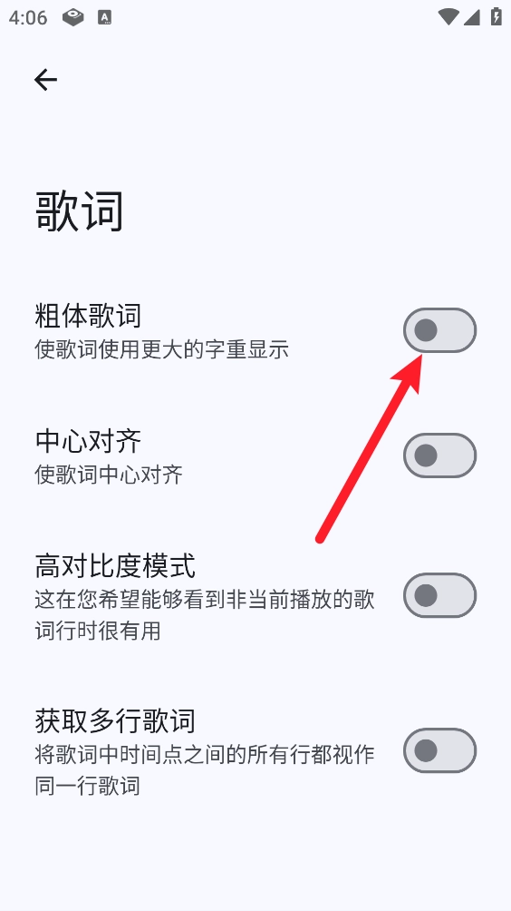 6、最后打开"粗体歌词"的开关即可。