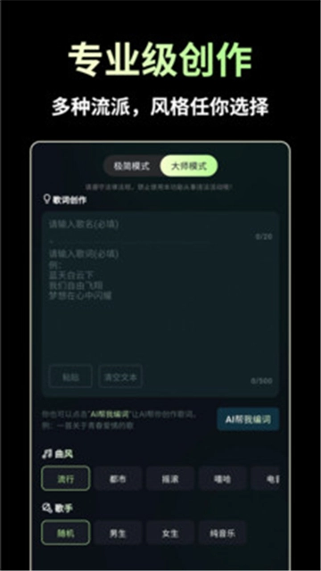 AI歌曲生成软件是一款智能化的音乐创作工具,具备专业的创作功能,支持多种流派与风格选择。创作完成后,你可以快速导出歌曲;也能借助它记录灵感,方便后续优化;还能输入文字将其转化为歌曲,实用性很强。
