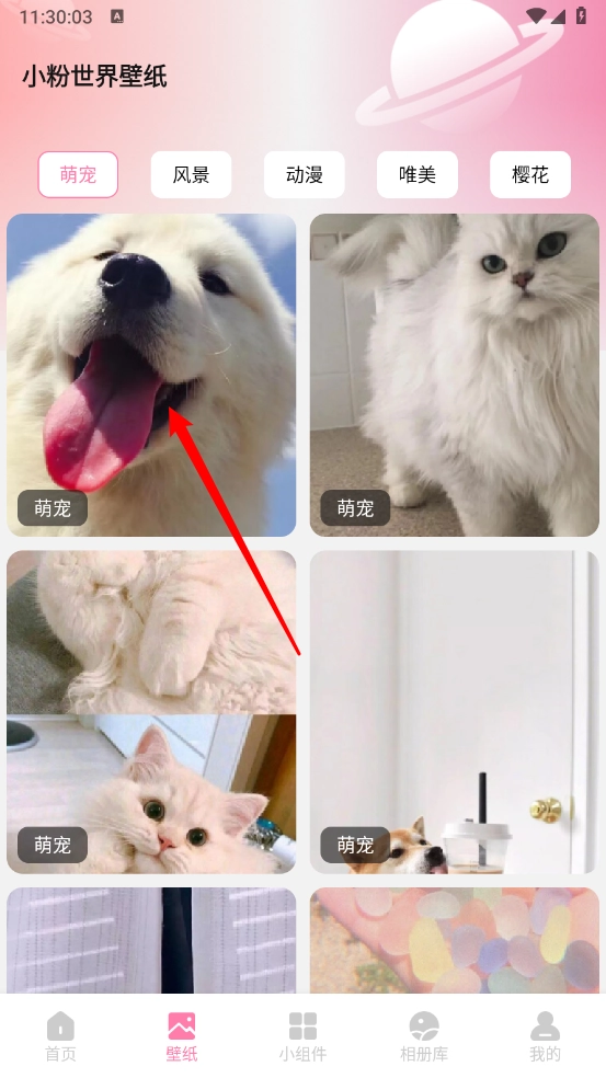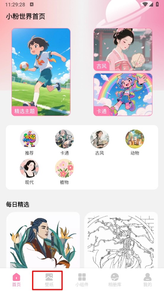 1、打开小粉世界壁纸,在首页点击"壁纸"进入。