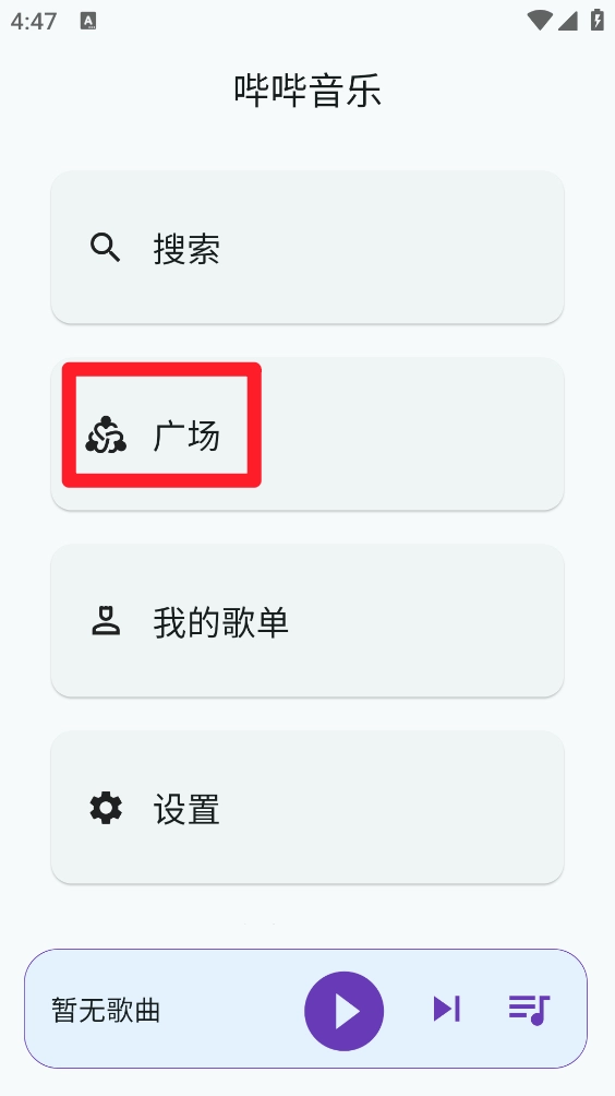 1、用户先在本站打开哔哔音乐,进入主页后点击“广场”。