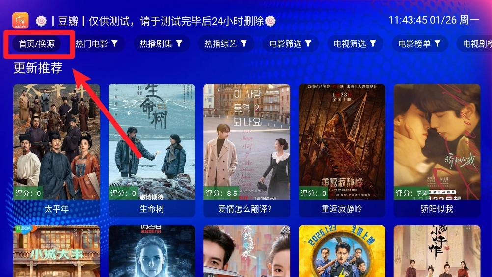 1、打开软件后,进入页面点击"主页/换源"按钮。