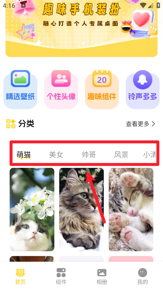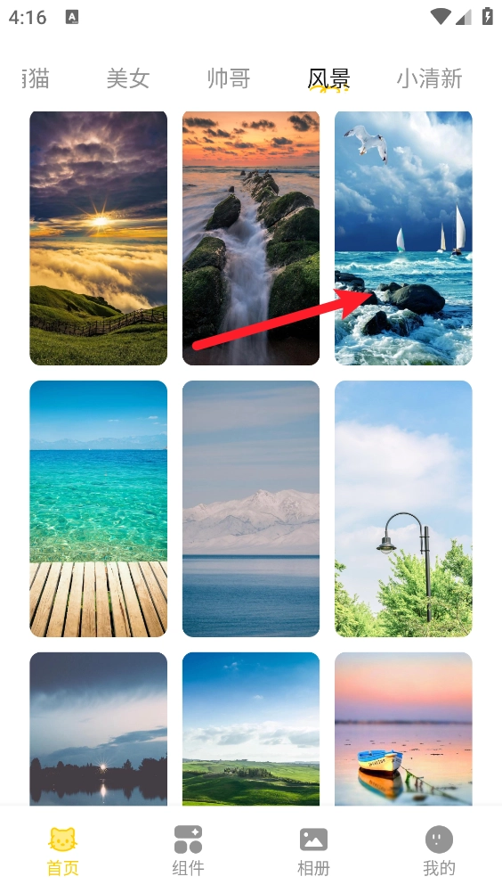 1、提供萌宠、风景、小清新、动漫等多种风格的精选壁纸,并且支持一键设置功能。