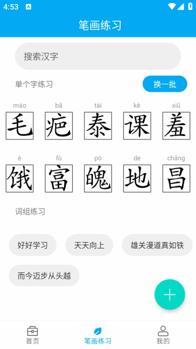 10、具备笔画顺序练习功能,支持3500个常见汉字的练习,既可以进行单个字的练习,也能够自定义词组练习,像名字、成语等都可以作为练习内容。