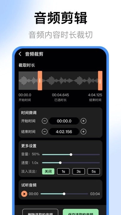 非线性剪辑功能支持多轨道音频拼接,用户能够通过拖拽时间轴来裁剪音频片段、调整播放顺序,还可以添加淡入淡出、回声等特效。