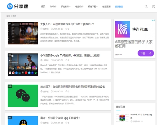 分享迷是一个资源丰富、更新及时且安全可靠的综合性分享平台,特别适合智能电视与机顶盒用户。它凭借简洁的界面、清晰的分类以及优质的资源服务,成为了众多用户的首选资源分享网站。要是你正在寻觅高质量的TV软件或其他互联网资源,分享迷绝对值得尝试。