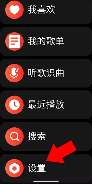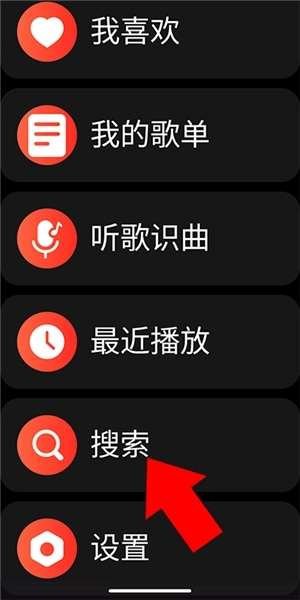 1、打开网易云音乐手表版,点击右上角的三条杠图标进入菜单界面,接着向下滑动找到搜索按钮。