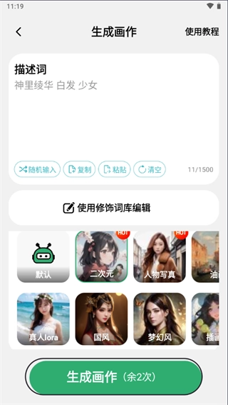 2、进入【生成画作】页面后,填写描述词,借助修饰词库进行编辑,接着选择画作风格、形状以及图片效果;待上述设置全部完成,点击【一键生成】按钮即可。