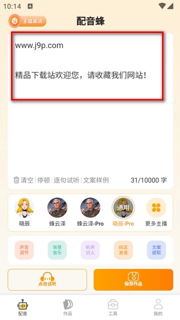 配音蜂能为用户提供专业的配音服务,软件里有多种不同音色可供选择,用户可以自由进行AI配音,轻松制作广告配音。此外,软件还提供丰富的音视频工具,为用户带来超多实用的功能服务。