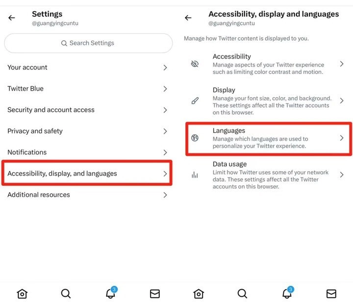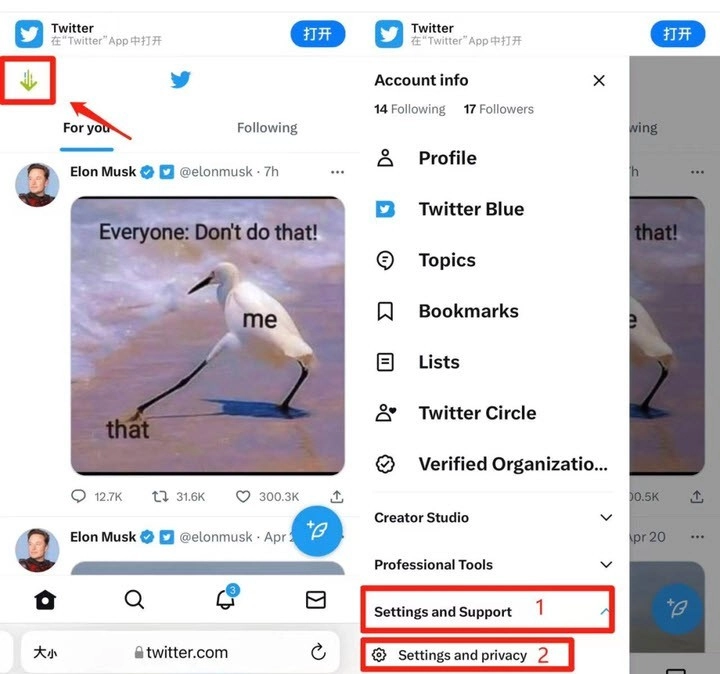 1、先登录推特网页版,点击左上角的头像,进入后向下滑动找到并点击“Settings and Support”,接着点击“Settings and privacy”