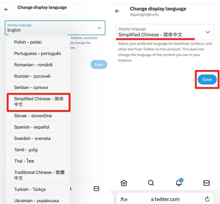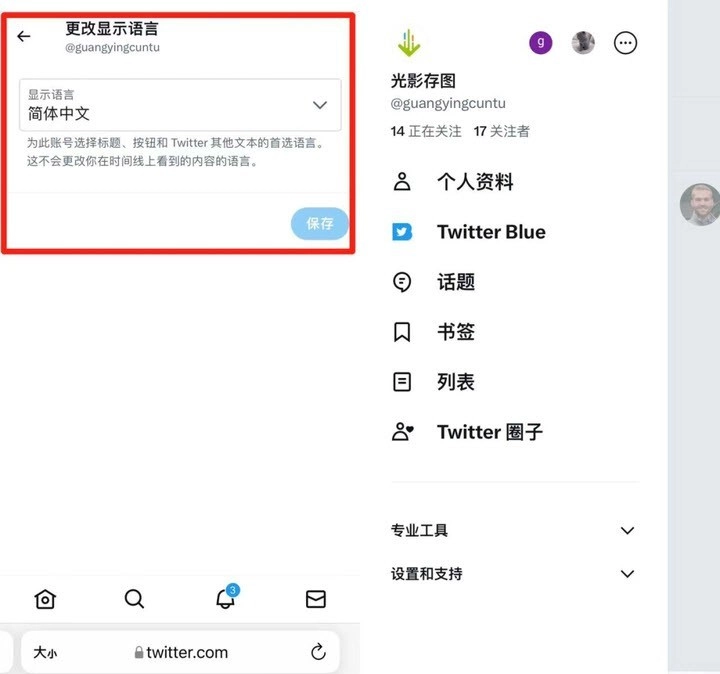 5、点击“Save”后,就能看到设置界面已切换为中文字体,此时重新打开twitter,便会发现它已经设置成中文了!
