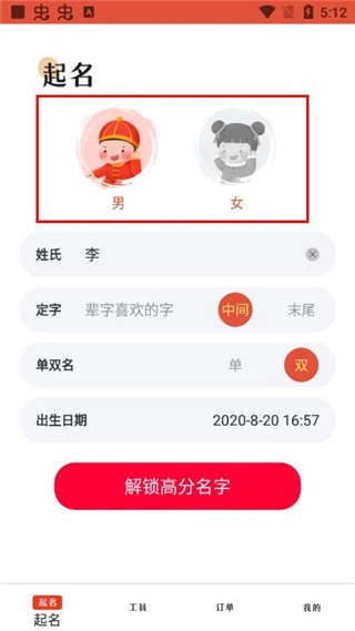 2、软件的操作流程十分简便,仅需在线输入宝宝的姓氏、出生年月以及性别即可。