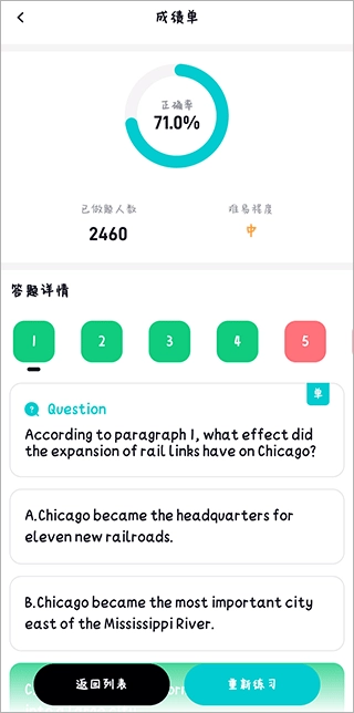 7、完成后软件会自动进行打分,其中绿色标记代表回答正确,红色标记则代表回答有误,若想了解错题的详细解析,可以下滑页面进行查看。