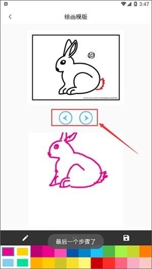 3、当前页面上方的画板展示的是绘画教程,点击该画板下方的按钮能够切换前后步骤,下方的画板可供我们跟随步骤开展创作。