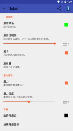 5、发现有液体相关的设置选项,包括液体的颜色、透明度和量等,此外还有重力选项,最后是背景选项。