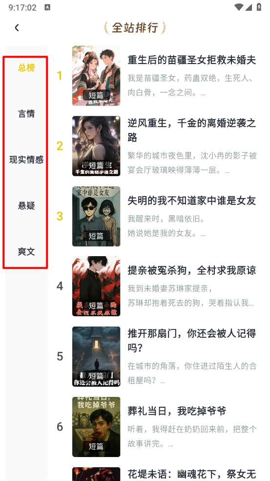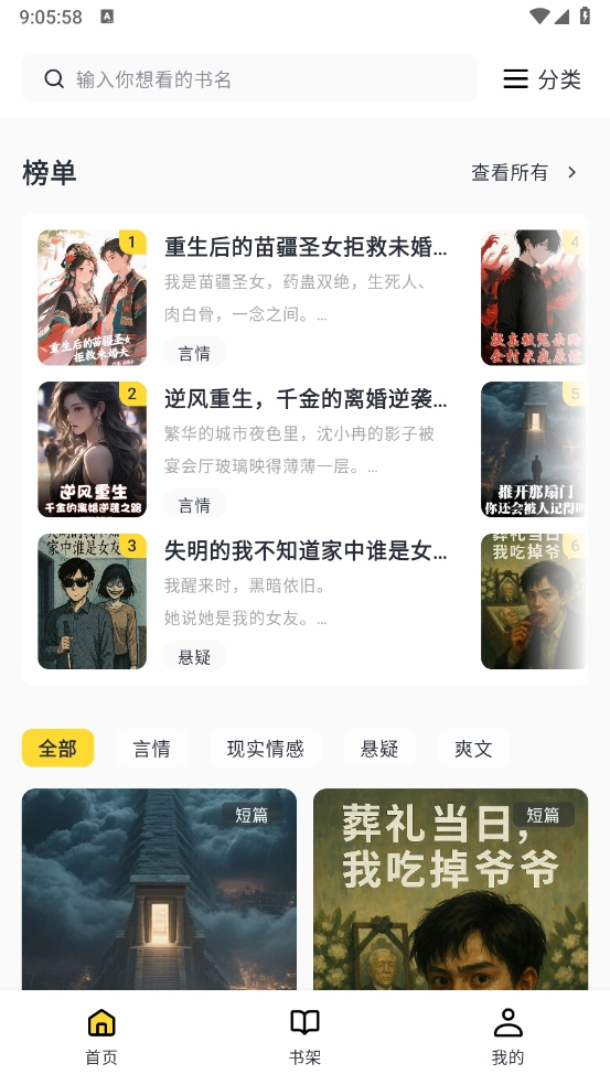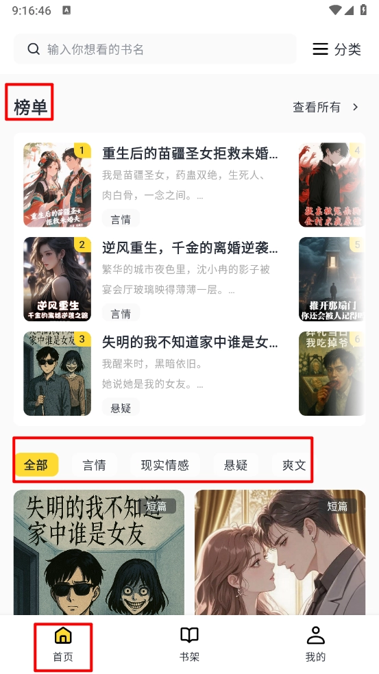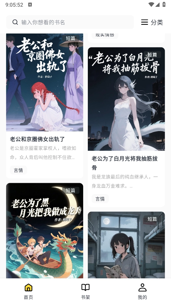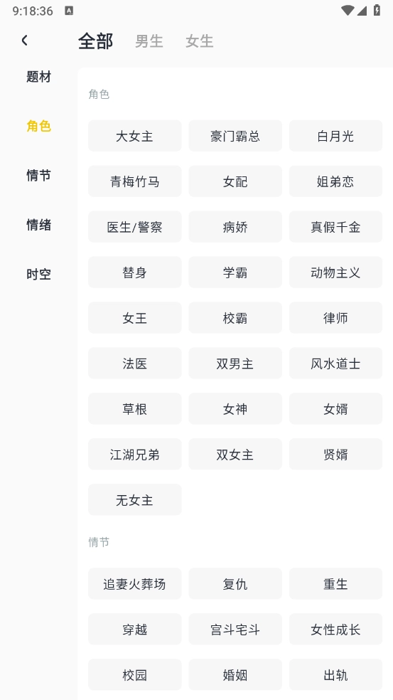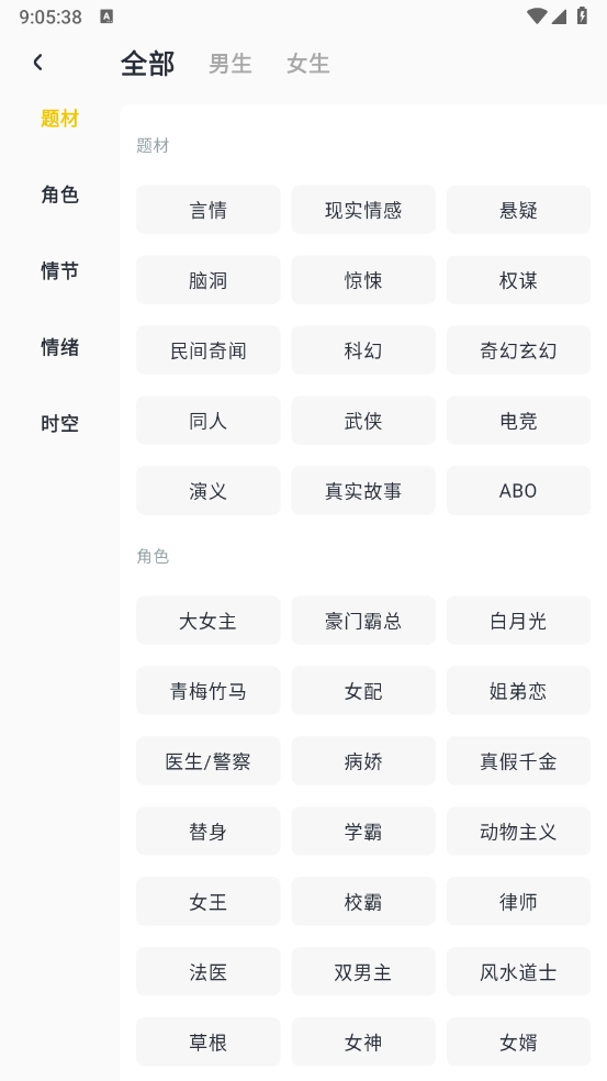 5、最后还能进入分类板块,按照题材、角色、情节等筛选并阅读自己喜欢的小说。