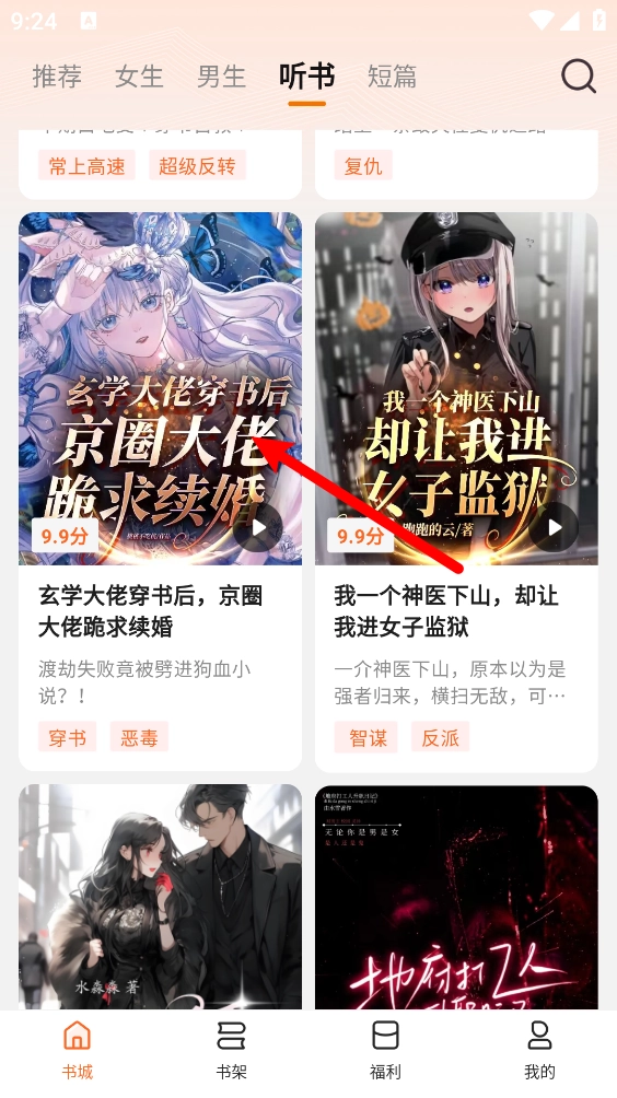 3、如图所示,滑动就可以选择喜欢的听书资源。