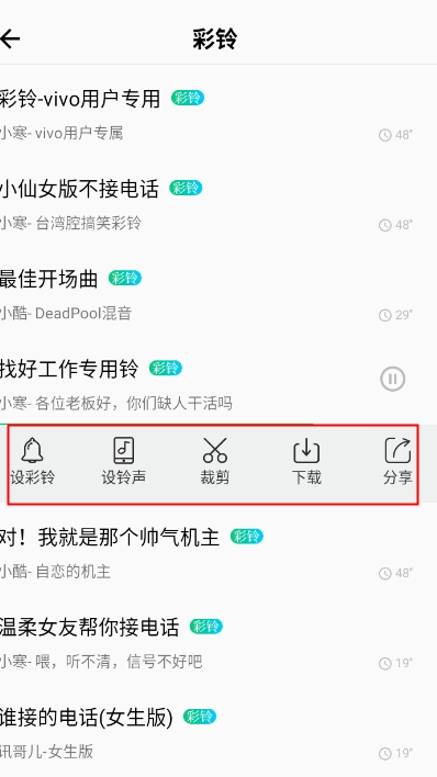 3、点击一首自己喜欢的彩铃,就能对它进行设置铃声、裁剪、分享等操作。