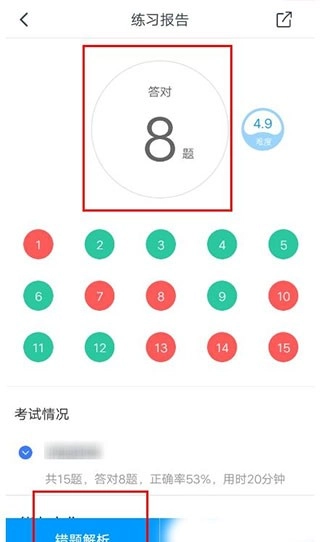 4、系统会生成一份练习报告,内容主要包含答对题目的数量、考试的整体情况,以及每道题的详细解析。若需要查看错题,点击“错题解析”即可。
