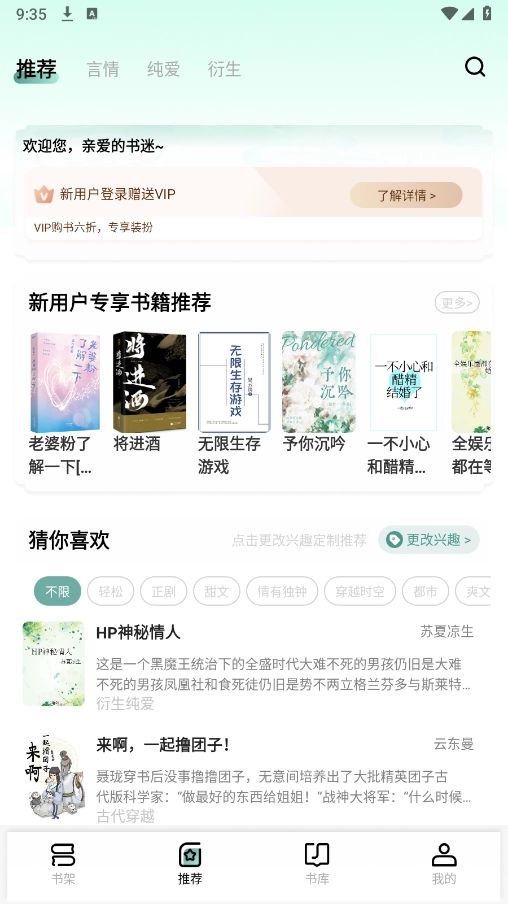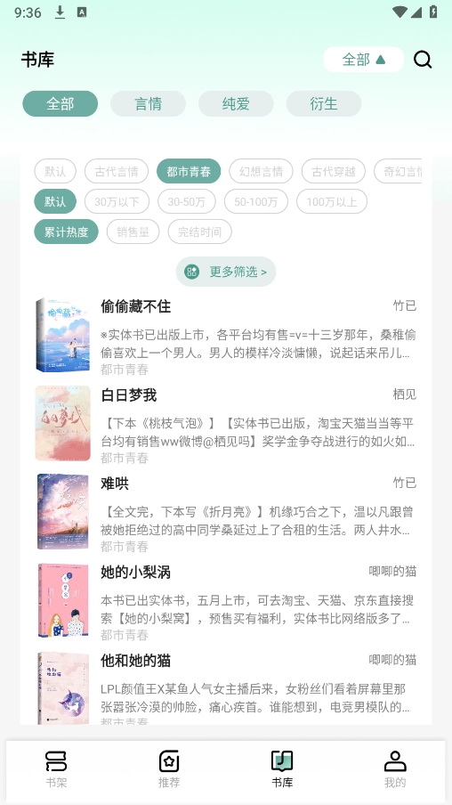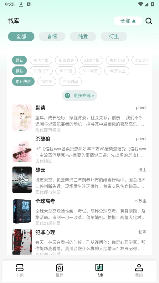 4、点击书库,里面有言情、科幻、都市等详细的小说分类。