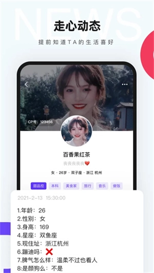 CP是为那些渴望认真谈恋爱的年轻人打造的服务,你的资料填得越完整、对待感情的态度越真诚,匹配到的CP质量就越高!