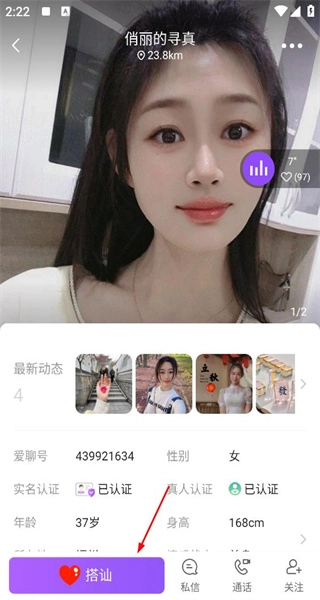 4、在同城列表里找到名为“俏丽的寻真”的用户,进入其个人主页后,可查看动态内容和身高详情,点击搭讪按钮就能开启交流。