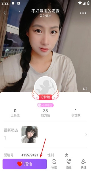 2、点击名为“不好意思的海露”的用户进入其个人页面,就能查看该用户的魅力值、获赞数等相关信息,点击页面上的搭讪按钮即可开启与该用户的互动。