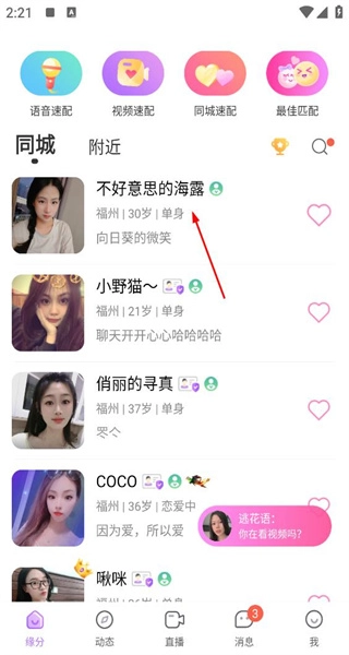1、打开软件后进入同城界面,能看到包含“不好意思的海露”在内的用户信息,可选择自己感兴趣的用户。