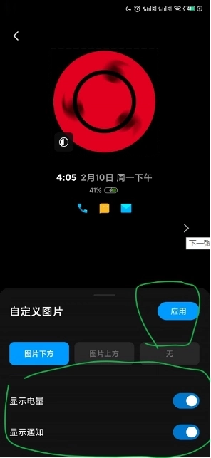 6、我们也能选择是否显示电量、是否显示通知,操作如图所示,点击“应用”按钮,完成这一步后,设置就成功生效了。