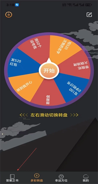 打开软件后,进入多彩转盘页面,能看到带有不同内容的转盘和开始按钮,接着点击底部的答案之书功能选项。