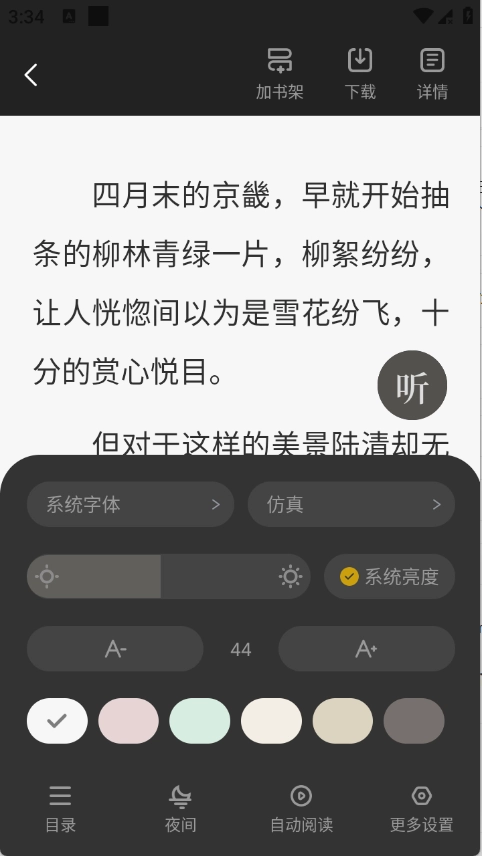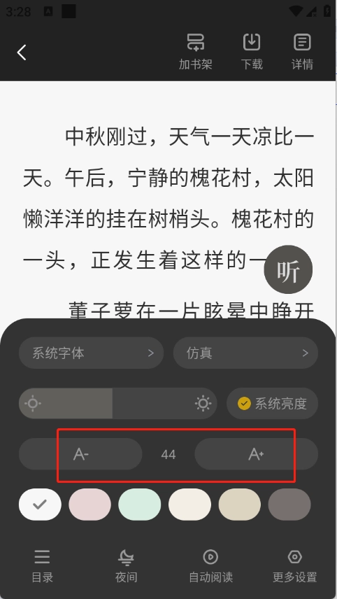 3、在阅读设置里,能够调整字体大小、背景颜色等选项,从而获得更舒适的阅读感受。