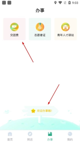 4.点击其中的办事功能,你可以办理一些政务信息相关的事务,例如团费缴纳、志愿者认证等。