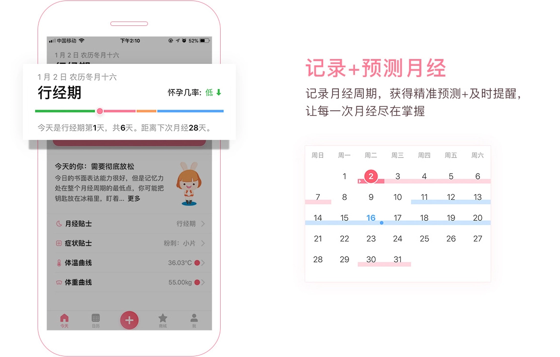 1、专为女性量身打造:紧密围绕女性生理周期及健康相关问题,功能设计更为细致周到
