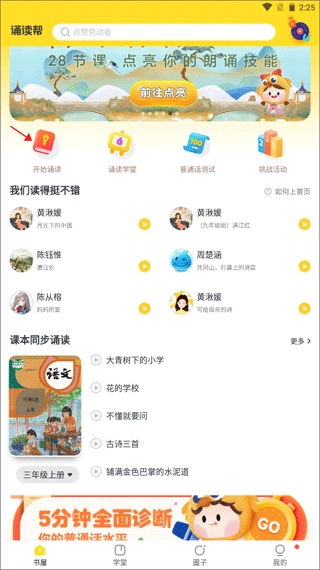 点击“开始诵读”标签,从书单里挑选内容来浏览与练习朗诵。