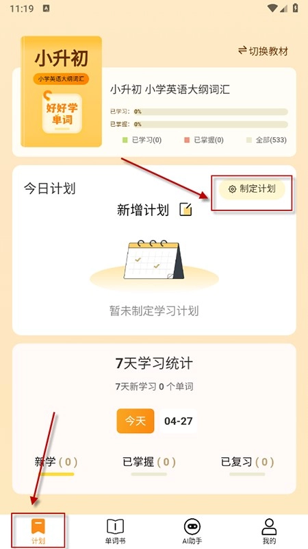 3、进入【计划】板块,你可以根据自己的情况自定义每日的单词背诵数量,按照适合自己的节奏来,就不会感到压力过大。