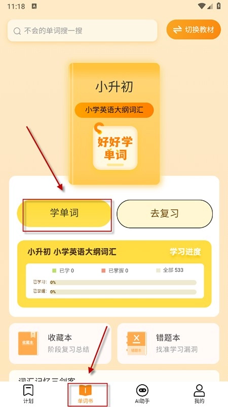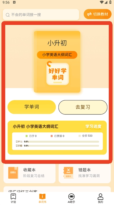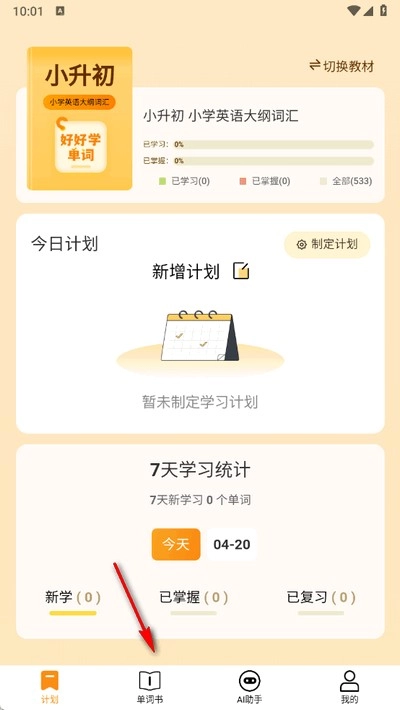 1、打开好好学单词后,进入软件首页,用户可点击下方的不同功能板块进行使用,点击【单词书】板块
