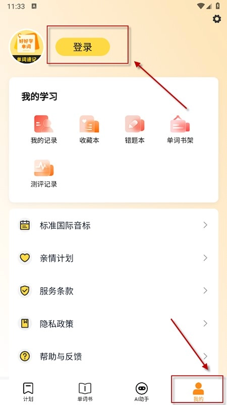 1、先认真学习单词,之后打开应用,点击底部的【我的】选项,完成账号登录操作。