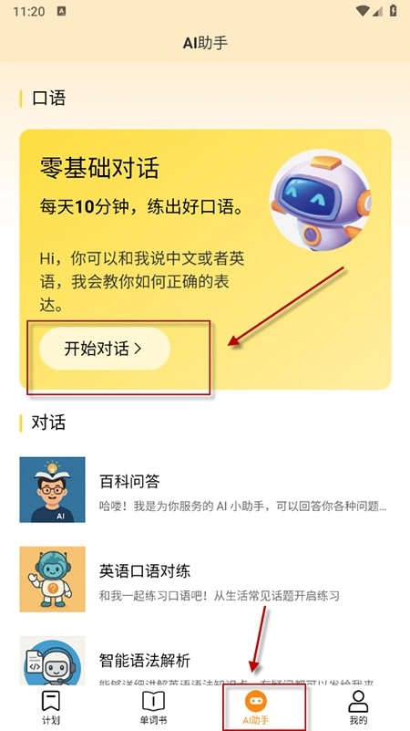 4、切换到【AI助手】界面,还能开启互动模式,通过边对话边学单词的方式,让学习变得轻松又有趣。
